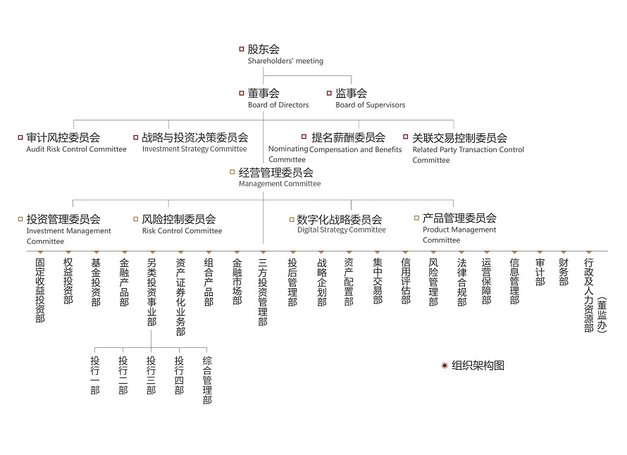 公司设立固定收益投资部、权益投资部、基金投资部、金融产品部、另类投资事业部、资产证券化业务部、组合产品部、金融市场部、三方投资管理部、投后管理部、战略企划部、资产配置部、集中交易部、信用评估部、风险管理部、法律合规部、运营保障部、信息管理部、审计部、财务部、行政及人力资源部(董监办)。其中另类投资事业部下设5个二级部门,分别为投行一部、投行二部、投行三部、投行四部和综合管理部。